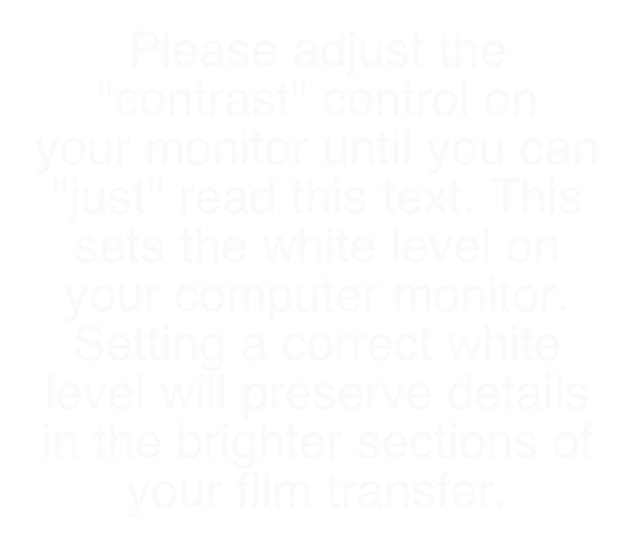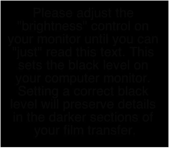 | All computer monitors and televisions must be set up properly to correctly reproduce the full range of the available image. Please adjust the "brightness" control on your monitor until you can "just" read the text contained in the black box below. |